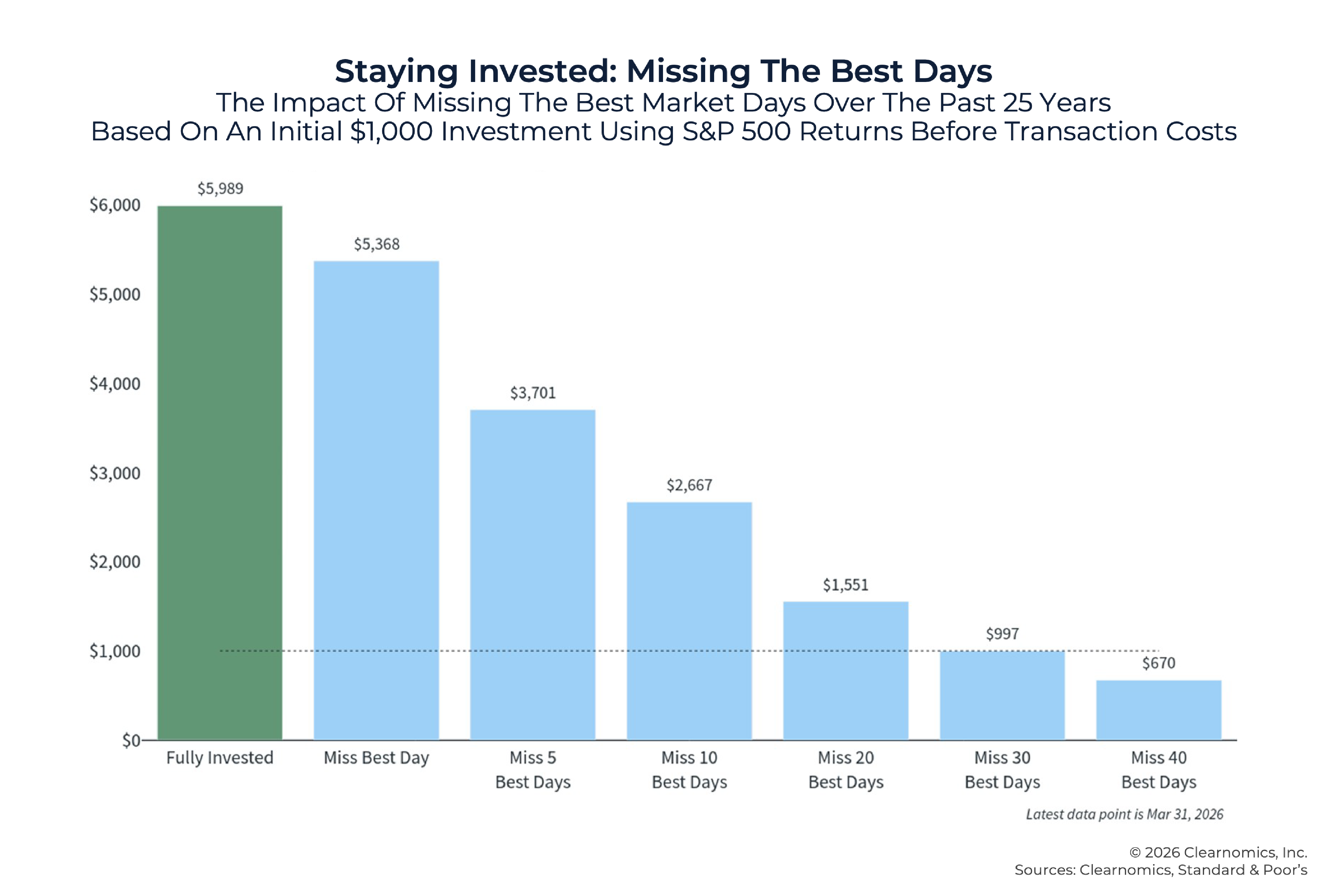 But history tells a different story. Periods of uncertainty are often when disciplined investing and thoughtful financial planning matter most. The challenge of staying invested is exactly what makes it so valuable over time. The goal isn’t to eliminate risk entirely, but to build a plan that can withstand a wide range of outcomes—so you can remain positioned for eventual recovery.